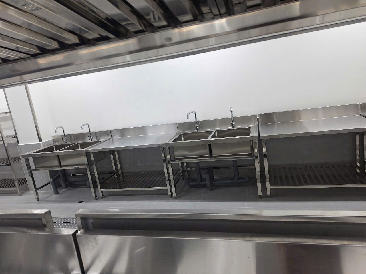 2. Khu Sơ Chế: Làm sạch, cắt thái thực phẩm sống (Tách biệt bồn rửa thịt, cá, rau).