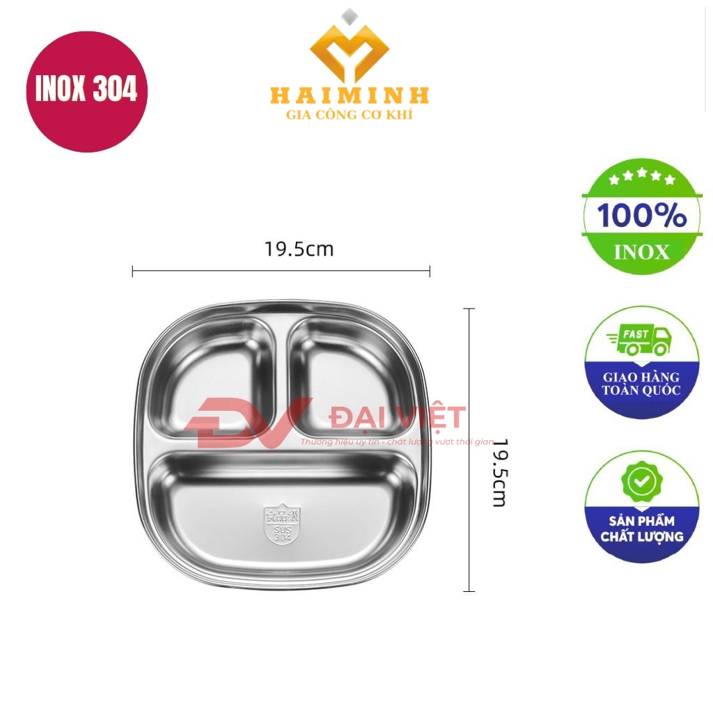 Tên sản phẩm: khay ăn cơm inox 3 ngăn 19,5 x 19,5 x 4 cm.