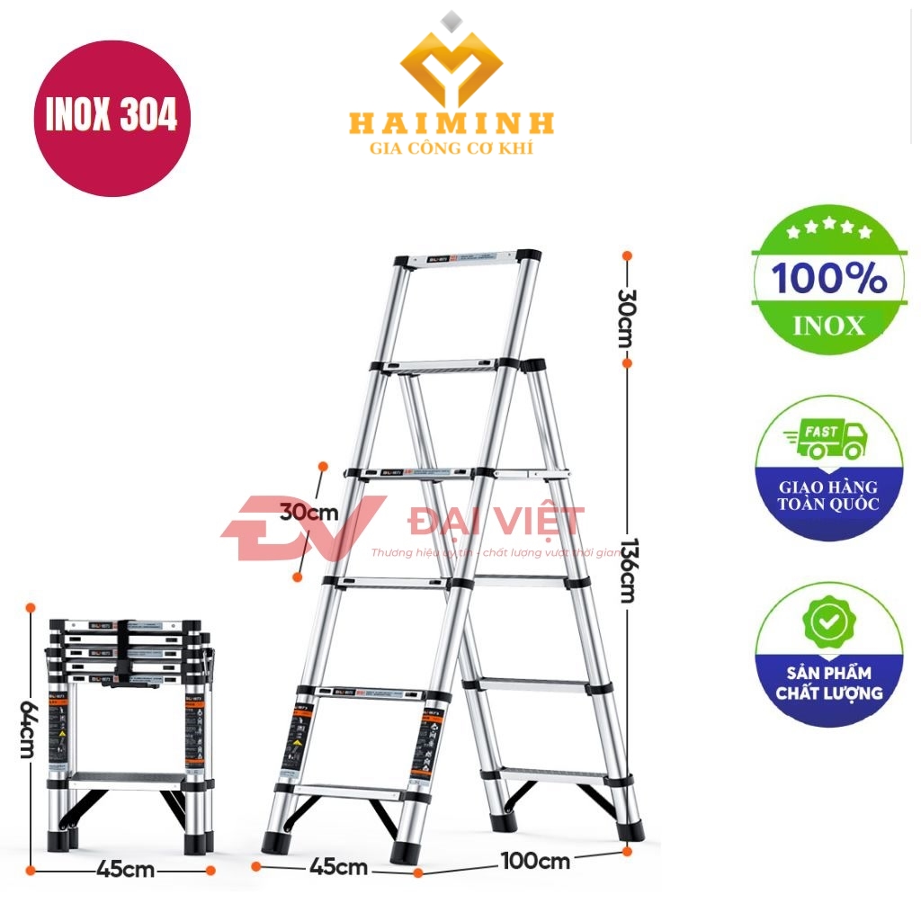 Thang inox 6 bậc dài 1.36m là lựa chọn tuyệt vời cho gia đình và văn phòng hiện đại. Chế tạo từ inox 304 cao cấp, thang bền và chống gỉ tốt. Nó nhẹ chỉ 7.8kg nhưng chịu được tải trọng 150kg. Sản phẩm này đáp ứng nhu cầu hàng ngày như thay bóng đèn, lau kệ cao, và thực hiện các công việc bảo trì nhỏ.