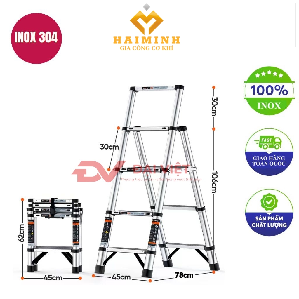 | Kiểu thang | Thang inox chữ A có thể rút gọn tiện lợi |